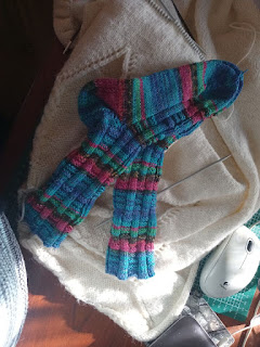 Eine Freundin kann so prima Wurst kochen , hat sie mir was abgegeben , weil sie selber diese Wurst nicht essen kann . Sie heißt Bärbel ist an Brustkrebs erkrankt , der wurde inzwischen operiert und sie kriegt seit 1 Jahr Bestrahlung . Sie sagt sie friert immer . Also hab ich angefangen für sie Socken zu stricken , damit wenigstens die Füße warm sind . In Gr. 36 und damit sie den Lebensmut nicht verliert schön bunt .